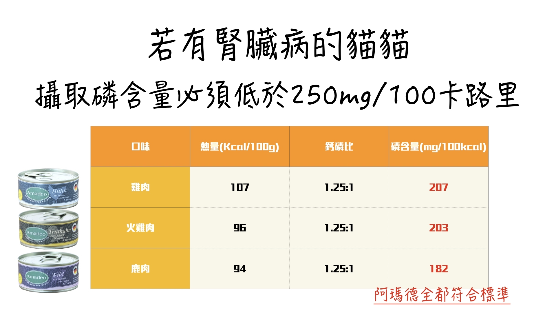 如果萬一貓貓年紀大,或是已經處於初期腎衰的狀況,你更應該選擇阿瑪德的貓罐,我們的磷鈣比非常標準,而且由於內臟沒有放這麼多,因此磷含量也很低,即使是初期腎病的貓咪吃也沒有問題!